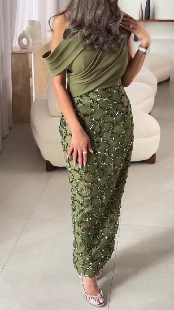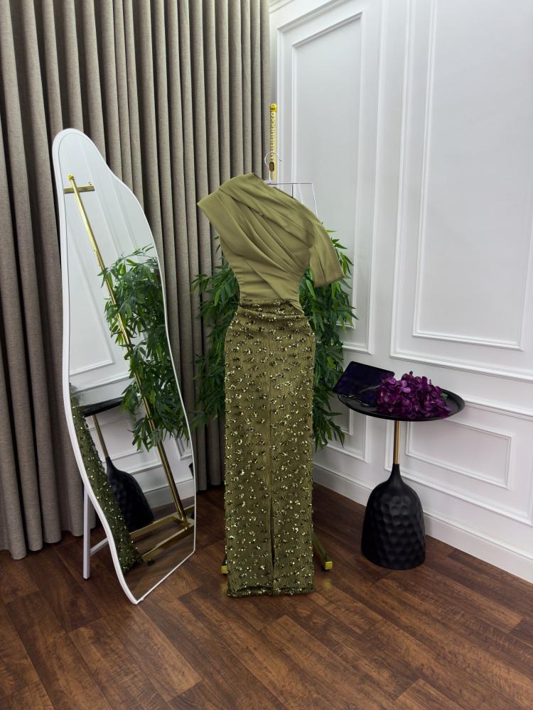 فستان سهرة أنيق باللون الزيتوني، يتميز بتصميم عصري يجمع بين الفخامة والنعومة. الجزء العلوي مصنوع من قماش ناعم مطوي بطريقة فنية بكتف واحد يمنح لمسة ملكية، بينما الجزء السفلي يتميز بتطريزات براقة متناسقة تضيف إشراقة راقية للفستان. القصة المستقيمة الطويلة تعزز من إطلالة أنثوية أنيقة ومناسبة للمناسبات الفاخرة والسهرات الخاصة