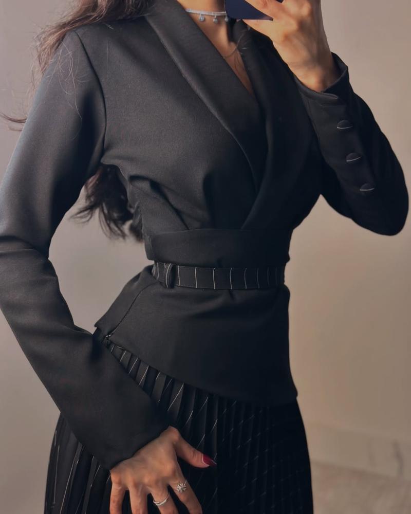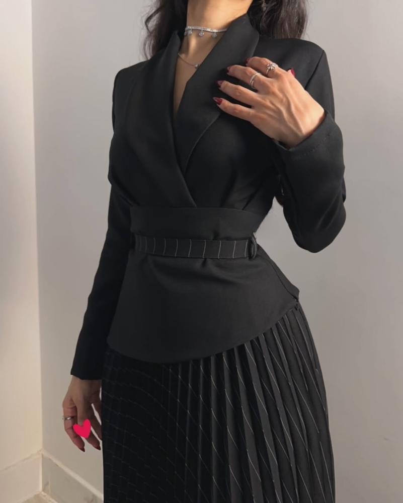 إطلالة أنيقة وعصرية باللون الأسود تجمع بين الطابع الكلاسيكي والحديث، مثالية للمناسبات الرسمية أو الإطلالات اليومية الراقية.