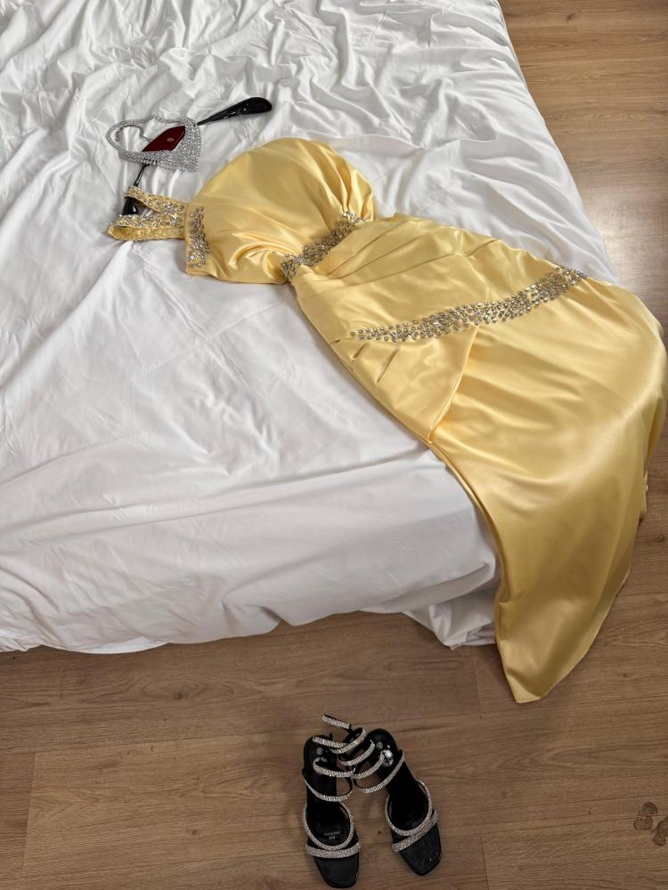 فستان سهرة طويل باللون الأصفر الذهبي مصنوع من قماش ساتان ناعم بلمعة فاخرة، يتميز بتصميم ضيق يبرز القوام مع حمالات مزينة بتطريز كريستالي لامع، وتفاصيل درابية أنيقة على الخصر والجنب تضيف لمسة أنثوية راقية، مثالي للمناسبات والحفلات الرسمية