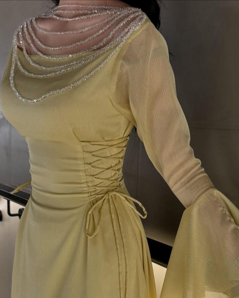 هذا المنتج عبارة عن فستان أنيق بلون أصفر فاتح، يتميز بتصميم راقٍ ومميز. إليك التفاصيل: