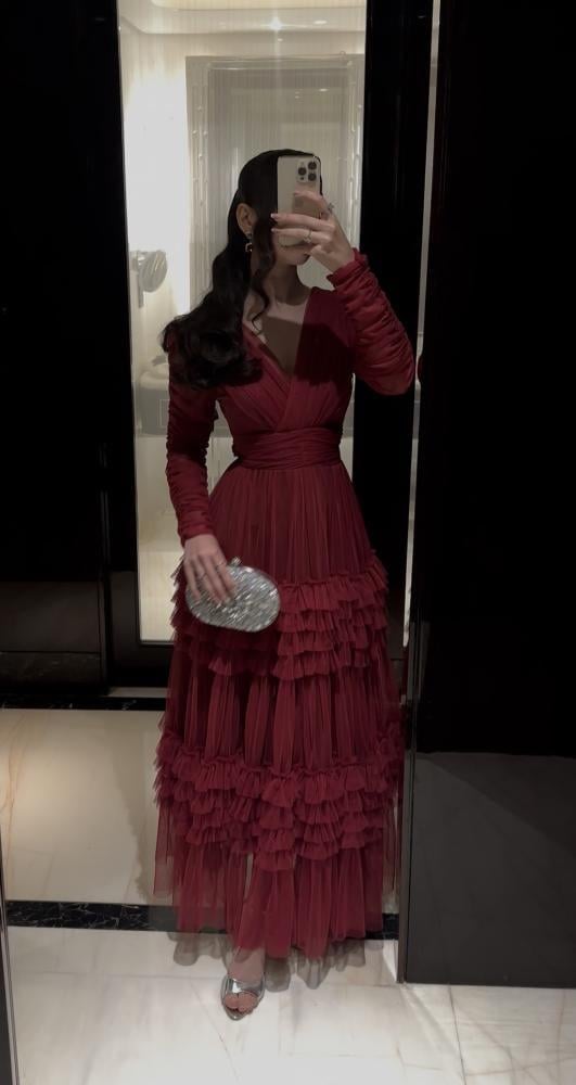 فستان سهرة أنيق باللون الأحمر الجذاب، يتميز بتصميم طويل انسيابي يضفي لمسة من الرقي والفخامة. الجزء العلوي يأتي بقصة ملفوفة مع ياقة على شكل V وأكمام طويلة تضيف لمسة كلاسيكية. أما التنورة فتتكون من طبقات متعددة من الكشكش المصنوع من التول الشفاف الناعم، مما يمنح الفستان حجمًا أنثويًا وحركة راقية عند المشي. نسق مع حقيبة كلاتش لامعة وحذاء بكعب فضي لإطلالة مسائية فاخرة تلفت الأنظار.