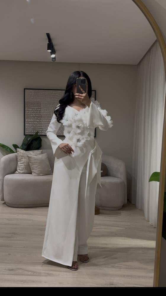 • عبارة عن بنطال واسع الساق بنفس لون القماش الأبيض، مما يعزز من الإطلالة العصرية .